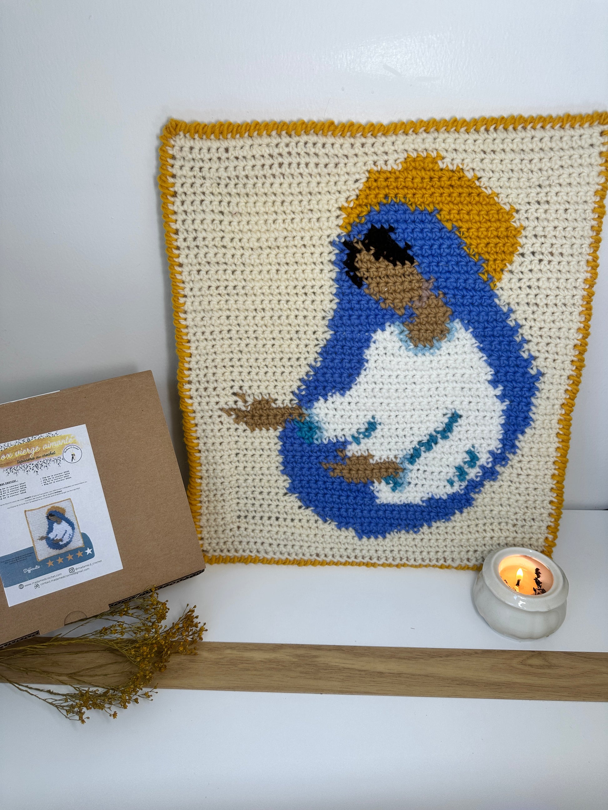 Box de crochet pour réaliser une tapisserie Vierge aimante d’environ 38,5 cm de large et 44 cm de haut.